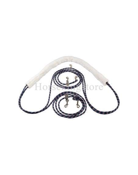 Le système d'enrênement Pessoa en corde est une aide précieuse lors de la formation des chevaux, il permet de mettre dans la position recherchée votre cheval lors du travail au sol. Le système dispose de poulies de renvoi et mousquetons permettant la fixation rapide aux diverses embouchures qui peuvent être utilisées lors de ce travail.
